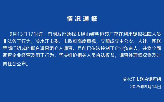 根据微信在9月13日的17:00左右对“ Lengshuijiang新闻”的官方帐户,一些网民报告说,湖南省Lengshuijiang City的Duoshan镇的Minghuan Brick Factory使用涉嫌残疾人进行了非法活动。 Lengshuijiang市政党委员会和市政政府非常重视它,并立即建立了一个联合调查小组,该组织由公共安全,人力资源和社会保障,残疾人和其他部门组成,以介入调查。目前,负责业务的人是根据法律控制的,并将全面调查工作的运营和行为,并不断照顾人员的合法权利和利益,并且对局势的调查和处理将在及时的及时表达。报告屏幕截图